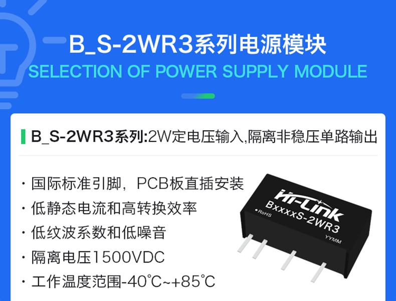 B S-2WR3系列--是海凌科爲(wèi)客戶提供小體積,高效率的微小功率,定電壓輸入,隔離非穩(wěn)壓單路輸出,DC/DC模塊電源;該系列產(chǎn)品是專門針對板上電源系統(tǒng)中需要產(chǎn)生一組與輸入電源隔離的電壓的應(yīng)用場合而設(shè)計的。該產(chǎn)品適用於:輸入電源的電壓比較穩(wěn)定(電壓變化範(fàn)圍土10%Vin);