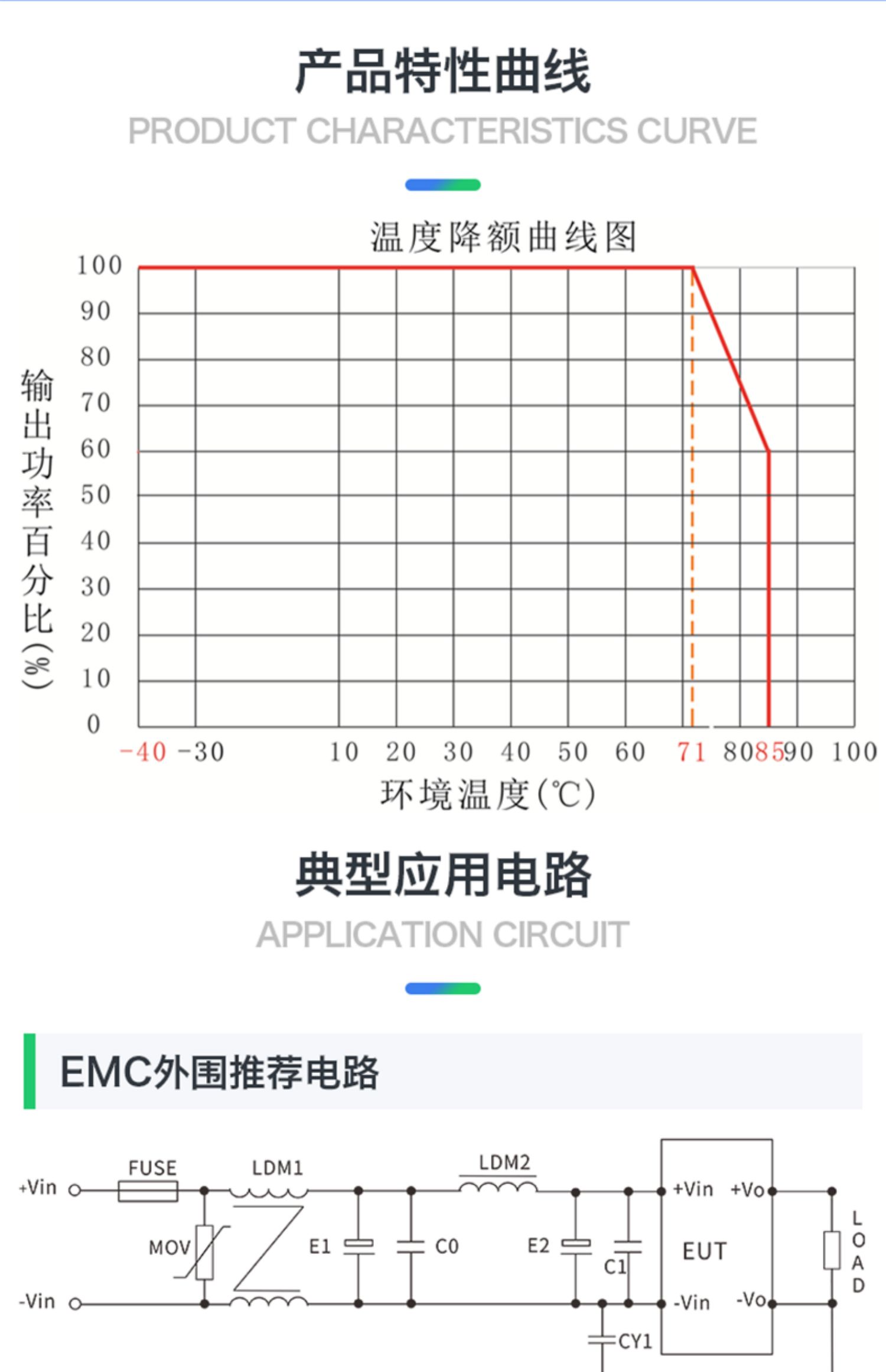 工作溫度範(fàn)圍:-40~+85°C輸入欠壓,輸出短路,過(guò)流,過(guò)壓保護(hù)