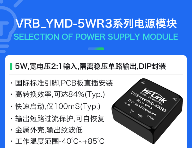 VR(A)B_YMD-5WR3 系列產(chǎn)品輸出功率爲(wèi) 5W,2:1 寬電壓輸入範(fàn)圍,效率高達(dá) 84%,1500VDC的常規(guī)隔離電壓,允許工作溫度-40°Cto+85°℃,具有輸出過壓、過流、短路保護(hù)功能廣泛應(yīng)用於醫(yī)療、工控、電力、儀器儀表、通信、鐵路等領(lǐng)域。