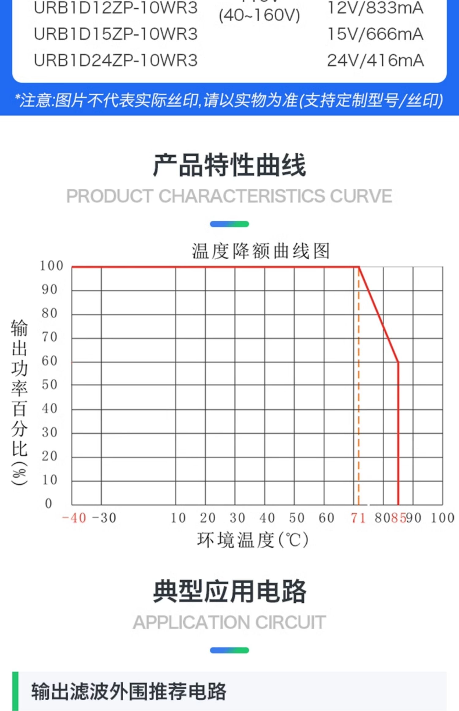 UR(A)B_ZP-10MR3 系列產(chǎn)品輸出功率爲(wèi) 10W,4:1寬電壓輸入範(fàn)圍,效率高達(dá) 91%,1500VDC 的常規(guī)隔離電壓,允許工作溫度-40℃to+85℃,具有輸入欠壓保護(hù),輸出過壓、過流、短路保護(hù)功能,裸機(jī)滿足 CISPR32/EW550320LASA,廣泛應(yīng)用於醫(yī)療、工控、電力、儀器儀表、通信、鐵路等領(lǐng)域。