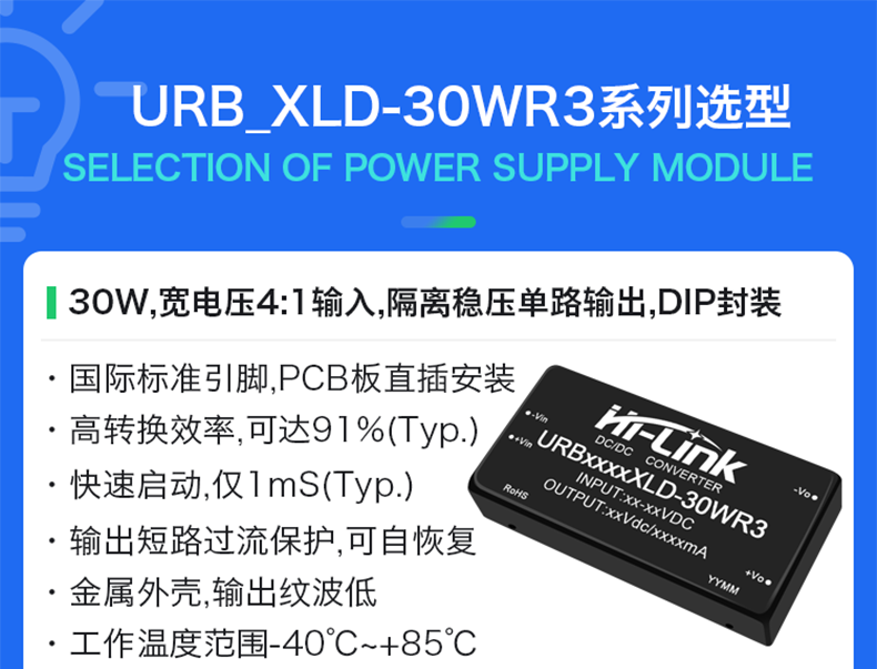 UR(A)BNLD-30MR3 系列)產(chǎn)品輸出功率爲(wèi) 30m,4:1 寬電壓輸入範(fàn)圍,效率高達(dá) 91%,1500VDC 的常規(guī)隔離電壓,允許工作溫度-40℃ to +85℃,具有輸入欠壓保護(hù),輸出過壓、過流、短路保護(hù)功能,裸機(jī)滿足 CISPR32/EN55032 CLASS A,廣泛應(yīng)用於醫(yī)療、工控、電力、儀器儀表、通信、鐵路等領(lǐng)域。