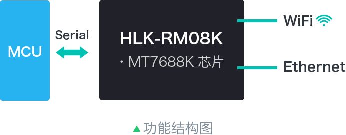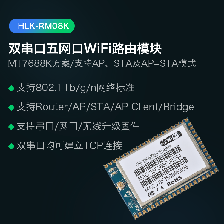HLK-RM08K是基於通用串行接口符合網(wǎng)絡標準的嵌入式WiFi模塊,內置TCP/IP協(xié)議棧,可實現(xiàn)串口、以太網(wǎng)、WiFi接口之間的相互轉換