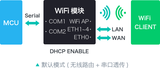 ·此模式下,WiFi設備能連接到模塊,成爲WiFi局域網(wǎng)下的設備;WAN 端默認動態(tài)IP地址方式。LAN、WiFi爲同一局域網(wǎng),默認開啓DHCP服務器。