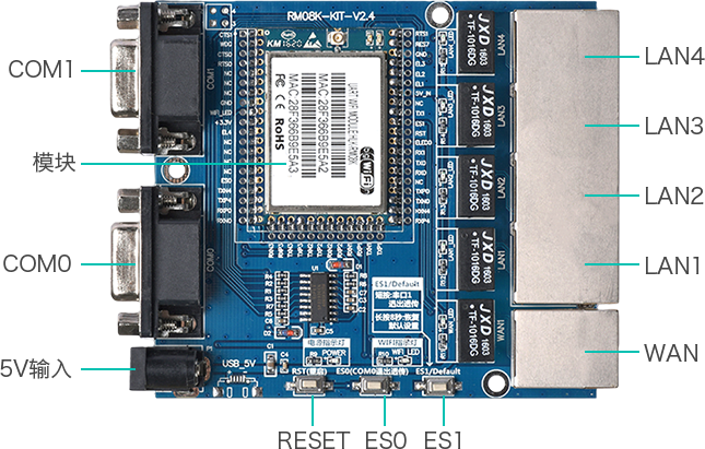 底板上ES0和RESET兩個按鍵,任意一按鍵長按6秒以上即可恢復出廠設置,不帶底板模塊地13和43引腳接地6秒以上。