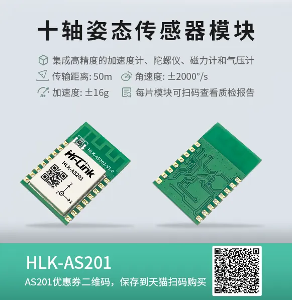 HLK-AS201模塊已經(jīng)在各大平臺全面上架,原價(jià)45.8元,活動(dòng)優(yōu)惠價(jià)低至35.8元,保存上方二維碼到淘寶即可領(lǐng)券購買! ONE 產(chǎn)品功能 陀螺儀也被稱爲(wèi)運(yùn)動(dòng)傳感器,主要是用來測量物體的旋轉(zhuǎn)方向、旋轉(zhuǎn)角速度,瞭解當(dāng)前設(shè)備的位置、方位和運(yùn)行速度。 HLK-AS201陀螺儀以x軸、y軸、z軸三個(gè)軸爲(wèi)基點(diǎn),測量物體的運(yùn)行速度和姿態(tài)。 每個(gè)軸對不同方位的角度進(jìn)行測量,實(shí)時(shí)輸出x軸、y軸、z軸的角速度和加速度數(shù)據(jù),以及三個(gè)軸的磁場數(shù)據(jù)和四元數(shù)數(shù)據(jù),從而可以獲得設(shè)備在三維空間中的旋轉(zhuǎn)角度和姿態(tài)角變化?。 TWO 產(chǎn)品特點(diǎn) 高度集成 輕量化 HLK-AS201姿態(tài)陀螺儀模塊,高度集成三軸加速度計(jì)、三軸陀螺儀、三軸磁力計(jì)和一軸氣壓計(jì)。 模塊體積小巧,大小僅24x16x2mm,重量2g,大幅度節(jié)省設(shè)計(jì)空間。 高穩(wěn)定性 高精準(zhǔn)度 HLK-AS201姿態(tài)陀螺儀模塊,Z軸航向角加入地磁傳感器濾波融合,解決了6軸算法中,由於陀螺儀積分的漂移引起的累計(jì)誤差,可長期穩(wěn)定輸出航向角數(shù)據(jù)。 模塊的加速度 0.01g(即0.098m/s2),角速度:0.03°/s,歐拉角 X和Y角度:+1°,Z角度:+5°(無磁干擾時(shí)),溫 度:0.01°℃'C(板上溫度),氣壓:0.006hPa,高 度:0.05m(氣壓穩(wěn)定時(shí))。 APP調(diào)參 測試簡單 在具體的應(yīng)用過程中,需要先查看每個(gè)AS201模塊上面二維碼的質(zhì)檢報(bào)告,首次使用建議使用海凌科測試套板(B35 V2.1),測試更簡單。模塊通過藍(lán)牙連接到手機(jī)後,可實(shí)時(shí)獲取查看角速度、角速度等數(shù)據(jù)。 THREE 應(yīng)用分析 以汽車爲(wèi)例,詳細(xì)介紹AS201模塊在汽車運(yùn)行過程中的姿態(tài)角檢測應(yīng)用。在汽車行駛過程中,可以實(shí)時(shí)通過AS201模塊掌握姿態(tài)角數(shù)據(jù)。 根據(jù)這些數(shù)據(jù),來獲取計(jì)算汽車的運(yùn)行速度和運(yùn)行軌跡,偏離導(dǎo)航時(shí)給出實(shí)時(shí)提示。尤其是在隧道等無信號的環(huán)境下,保障汽車精準(zhǔn)導(dǎo)航,?提高導(dǎo)航精度,駕駛安全進(jìn)一步提升。 HLK-AS201陀螺儀模塊性價(jià)比高、性能優(yōu)異,除了可用於汽車導(dǎo)航中,還可用於下列等多箇應(yīng)用場景中。 虛擬現(xiàn)實(shí)/增強(qiáng)現(xiàn)實(shí),頭戴顯示器 遊戲手柄 農(nóng)業(yè)自動(dòng)耕種 無人機(jī),載人飛行器 工業(yè)姿態(tài)監(jiān)控 醫(yī)療設(shè)備 人體動(dòng)作跟蹤/捕捉平衡車, 機(jī)器人,自動(dòng)引導(dǎo)運(yùn)輸車 無人駕駛/輔助駕駛
