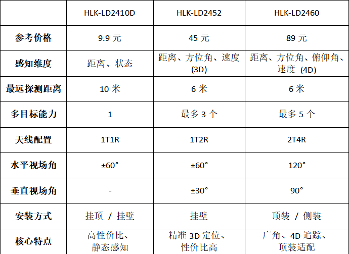 不同應(yīng)用場(chǎng)景和成本考量下的演進(jìn)路徑。HLK-LD2452 憑藉其均衡的功能、直觀的可視化工具和極具競(jìng)爭(zhēng)力的價(jià)格,成爲(wèi)我們主推的型號(hào),尤其適合作爲(wèi)大多數(shù)智能項(xiàng)目