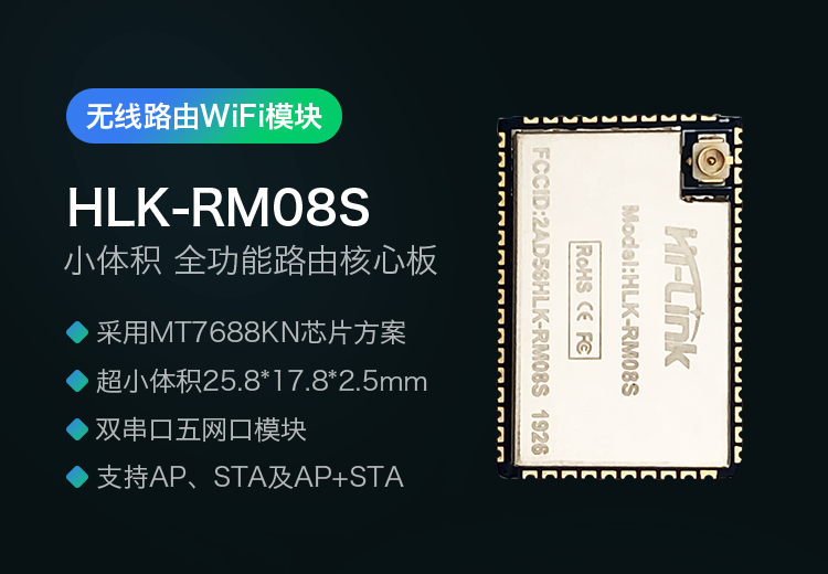 HLK-RM08S是基於通用串行接口符合網(wǎng)絡(luò)標(biāo)準(zhǔn)的嵌入式WiFi模塊,內(nèi)置TCP/IP協(xié)議棧,可實(shí)現(xiàn)串口、以太網(wǎng)、無線網(wǎng)(WIFI)接口之前的相互轉(zhuǎn)換。