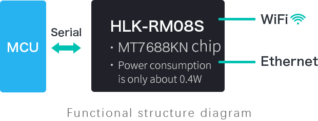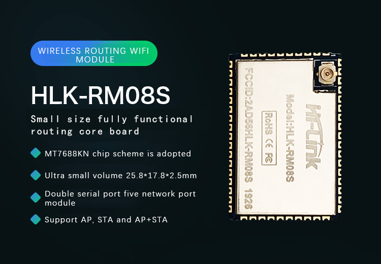 HLK-RM08S is an embedded WiFi module conforming to network standards based on a universal serial interface, with a built-in TCP/IP protocol stack, which can realize the mutual conversion between serial port, Ethernet, and wireless network (WIFI) interfaces.