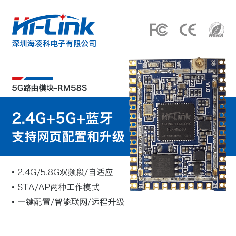 HLK-RM58S是海凌科電子基于MTK芯片平臺研制出的一款低成本嵌入式 UART-WIFI(串口-無線網(wǎng))模塊,內嵌 TCP/IP 協(xié)議棧,能夠實 現(xiàn)用戶串口-無線網(wǎng)(WIFI)之間的轉換。